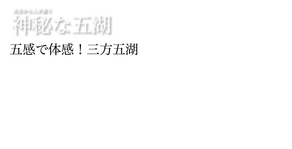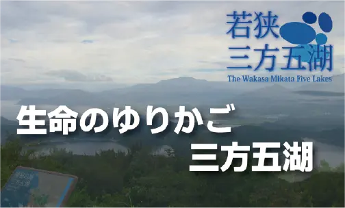 福井県三方五湖周辺地域は、類い稀なる貴重な地形を持ち、太古から人々が集い文明の起点となった世界に誇れる特別な場所です。美浜町と若狭町に位置する三方湖、水月湖、菅湖、久々子湖、日向湖の5つの湖は繋がっており、豊かな山々から流れ込んだ清らかな川の水はそれぞれの湖を流れて日本海に通じます。同時に、海から入り込む海水によって5つの湖では異なる塩分の濃度を持ち、水質や水深の違いからすべて濃さの違う青色に見えることから「五色の湖」とも呼ばれています。
