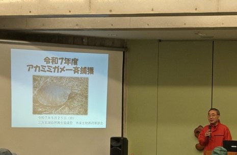5月25日(日)に三方五湖のアカミミガメ一斉捕獲調査を実施しました。当日はあいにくの雨でしたが、外来生物等対策部会の部会員の皆さんのほか、7家族24人にも参加いただき、事前に設置した罠の回収やアカミミガメの計測、そのほかの生き物の観察などを行いました。