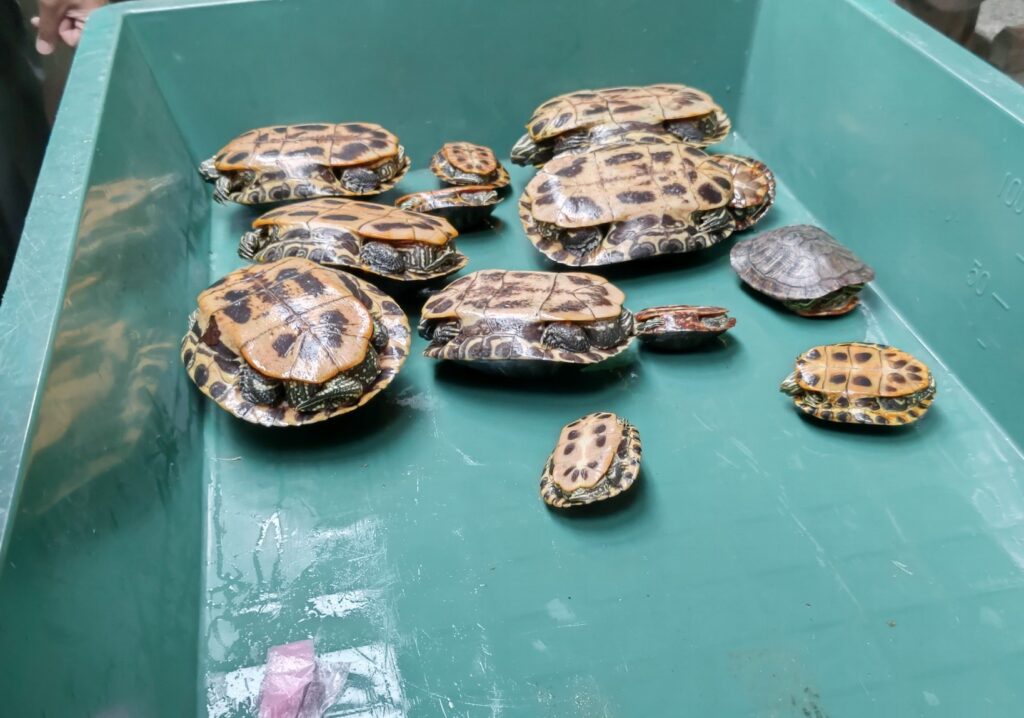 今年は13匹のアカミミガメを捕獲し、一番大きな個体は約23cm・約1.5kgでした。