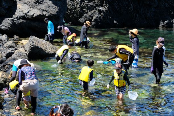 食見海岸に面した福井県海浜自然センターを会場に、磯に浸かって波間を素早く泳ぐトウゴロウイワシやメジナの稚魚の群れを観察しながら、磯場を進みます。岩場の穴をのぞき込むとヘビギンポやアナハゼが隠れていました。